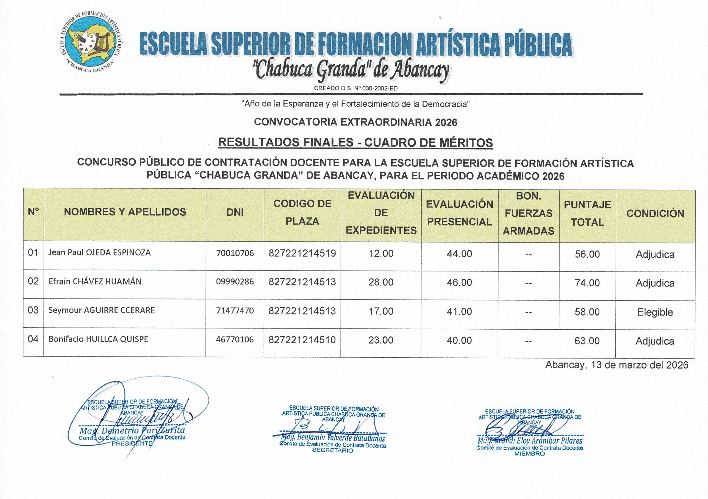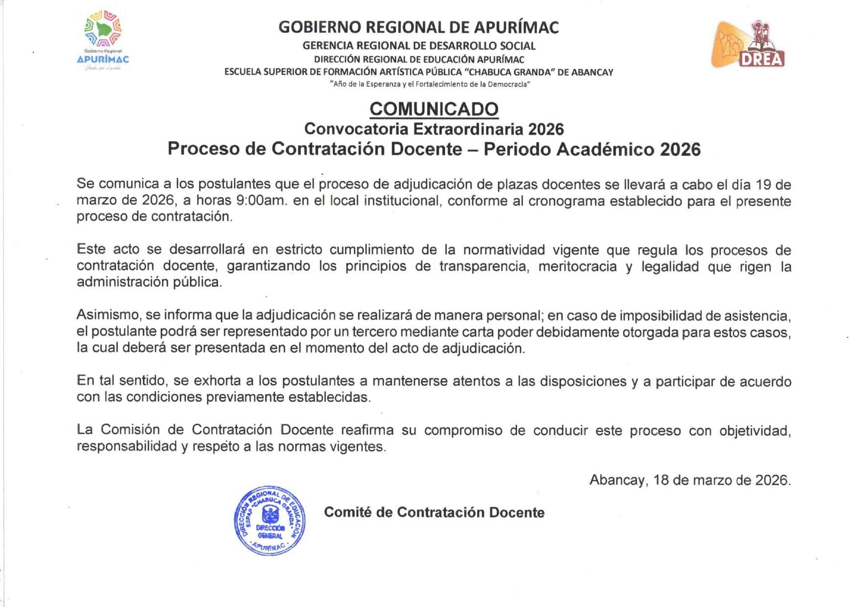 Bases de la convocatoria al concurso público de contrata de docentes de la Escuela de Formación Artística Pública «Chabuca Granda» de Abancay, correspondiente al año académico 2026